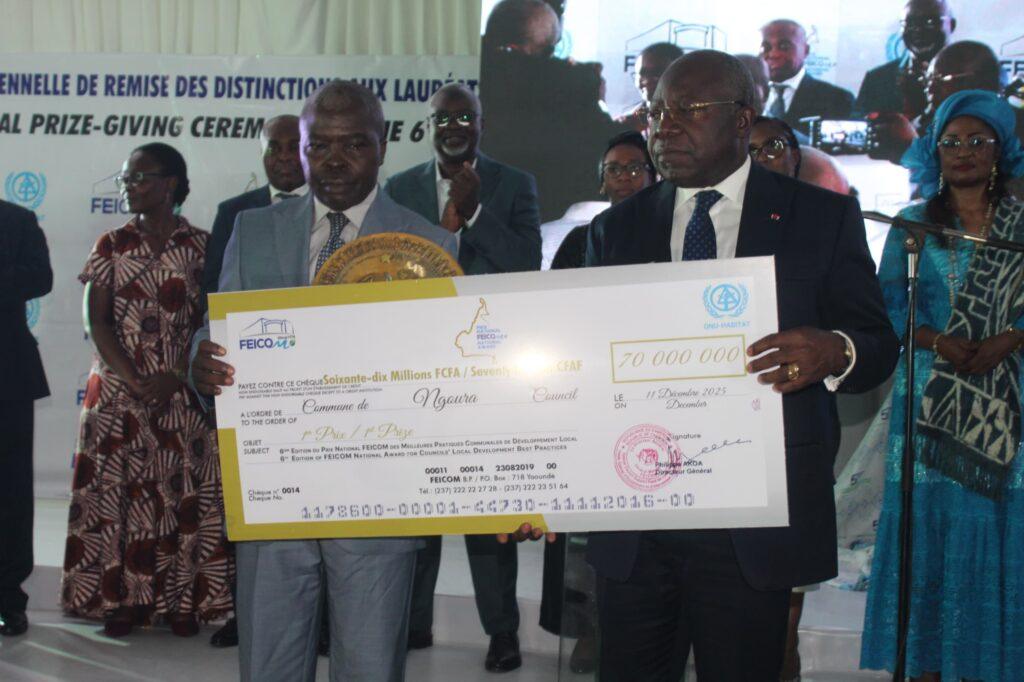 Le cérémonie solennelle de remise des récompenses de la 6e édition du Prix National FEICOM, présidée par le Ministre de la Décentralisation et du développement local, Georges Elanga Obam, s’est tenue le 11 décembre 2025, au siège de l’institution à Yaoundé – Mimboman. Au total, 17 initiatives primées, pour une cagnotte globale de 435 millions de FCFA. Le 1er Prix National FEICOM 2025, d’une valeur de 70 millions de FCFA, a été remporté par la Commune de Ngoura, dans le département du Lom et Djérem, région de l’Est Cameroun. Tandis que le 2e Prix, de 50 millions de FCFA, a été gagné par la Commune de Nkoteng ; et le 3e Prix de 30 millions de FCFA a été décroché par la Commune de Djohong.