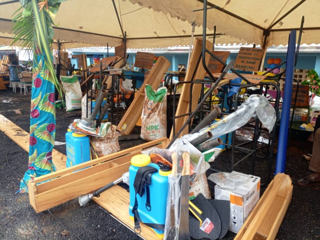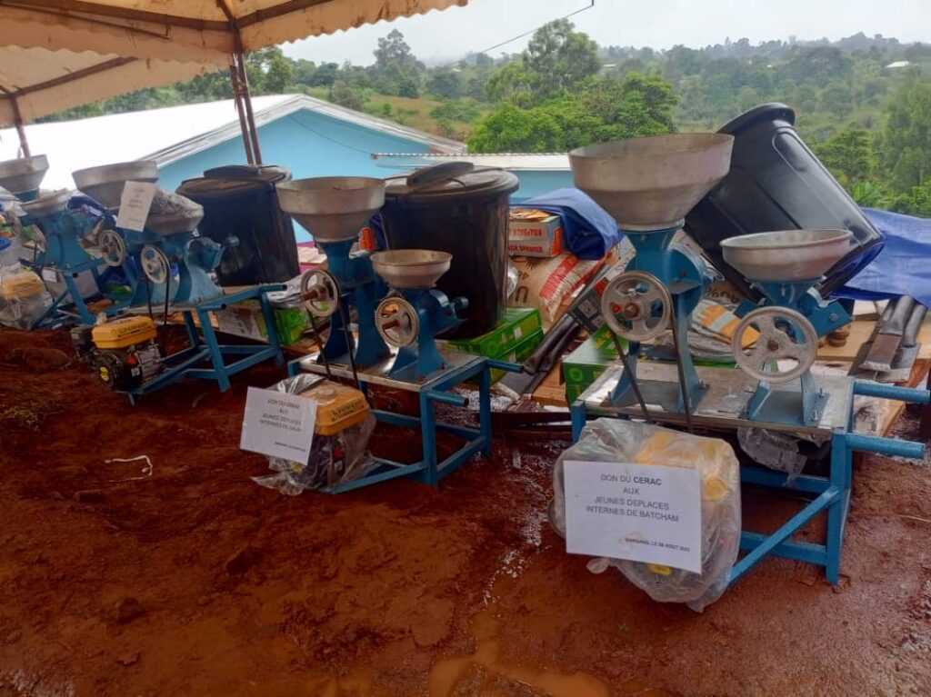 Afin de soutenir également l’autonomisation des femmes et des jeunes, à travers le développement des activités économiques et agricoles, le CERAC, comme il en n’est de tradition en de pareille circonstance, est venu avec des dons importants en fournitures scolaires et paquet minimum pour l’école de Ngueamatio, ainsi qu’en matériels et intrants agricoles, pour les associations et Gic’s des femmes, des jeunes et des déplacés internes des arrondissements de Batcham, de Babadjou, de Mbouda et de Galim. Il s’agit entre autres de 144 sacs de semences améliorées de maïs ; 96 sacs d’engrais chimiques ; 192 litres de fongicides ; 192 pulvérisateurs classe « B » ; 192 moto-pompes ; 96 atomiseurs ; 240 insecticides ; 480 joues ; 288 machettes ; 384 plantoirs et scies à moteurs ; une tarière à moteur ; 4 machines egraineuses de maïs ; une machine rapeuse à manioc ; 4 tricycles ; un engermoir automatique ; 30 mangeoires et 30 abreuvoirs.