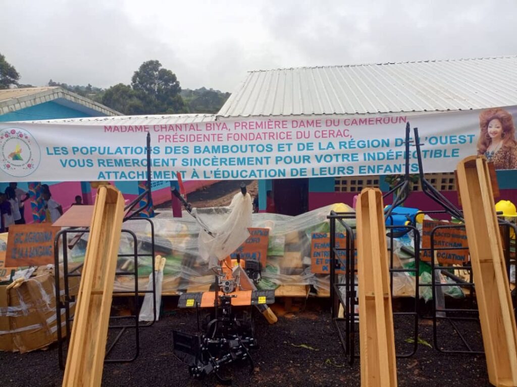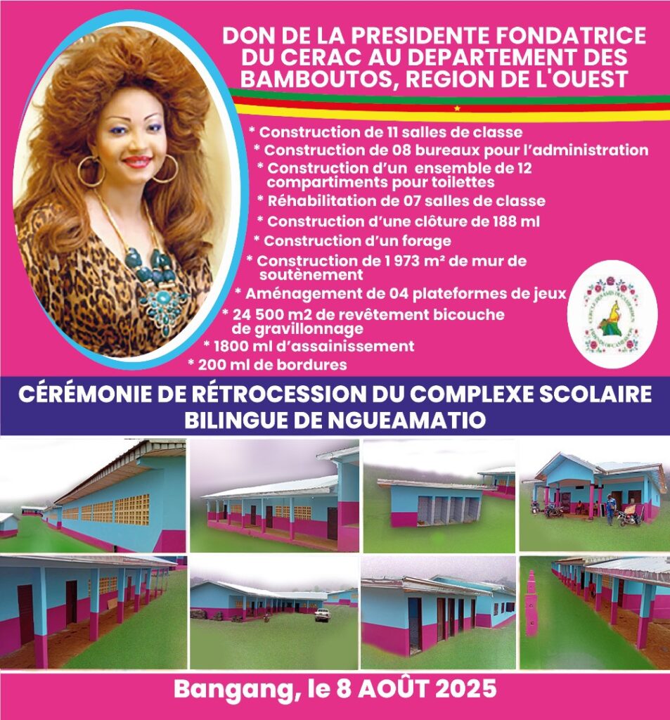 La journée du vendredi 08 août 2025, restera à jamais gravée dans les coeurs et les esprits des centaines de parents, ainsi que des élèves bénéficiaires, à travers la cérémonie de rétrocession du complexe scolaire bilingue de Ngueamatio, rénové et équipé par le Cerac ; couplée de la remise de dons aux femmes rurales, jeunes et déplacés internes du département des Bamboutos ; sous la conduite de madame le Ministre de la Promotion de la femme et de la famille, Pr. Marie-Thérèse Abena Ondoa, représentante personnelle de la Première dame du Cameroun, Chantal Biya, Presidente fondatrice du Cercle des amis du Cameroun (CERAC).